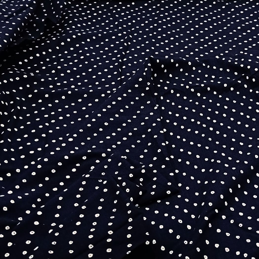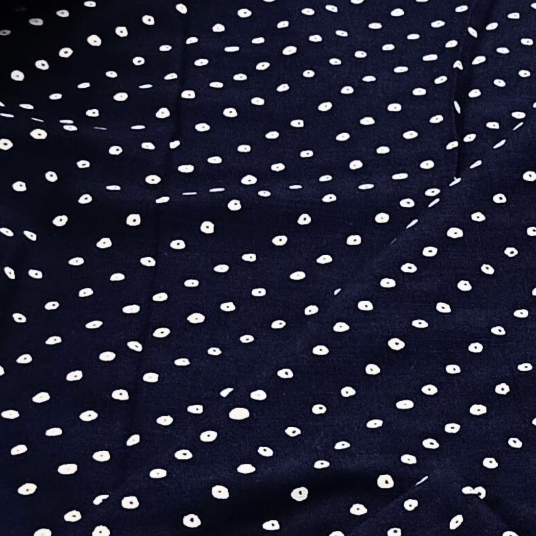 This beautiful deep indigo fabric features delicate white dotted motifs, creating a timeless and playful pattern. Crafted using traditional techniques, the fabric has a soft, breathable feel with a natural fall, making it ideal for both everyday wear and statement pieces. The scattered dot design adds subtle charm while the rich indigo base brings depth and elegance.