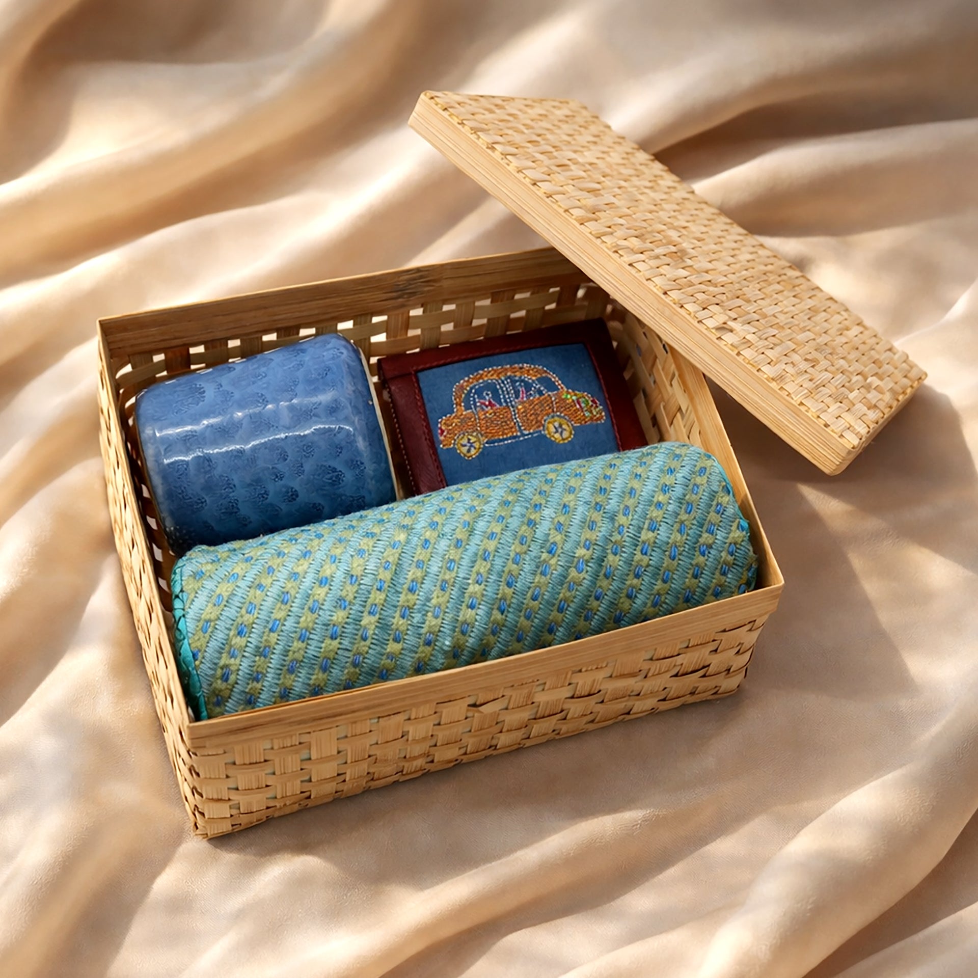 A thoughtfully curated gift hamper that blends everyday comfort with handcrafted charm. Housed in a beautifully woven natural bamboo box with a ceramic mug ,silk batua bag and kantha stitched car motif leather box. This hamper is perfect for those who appreciate subtle luxury and meaningful details