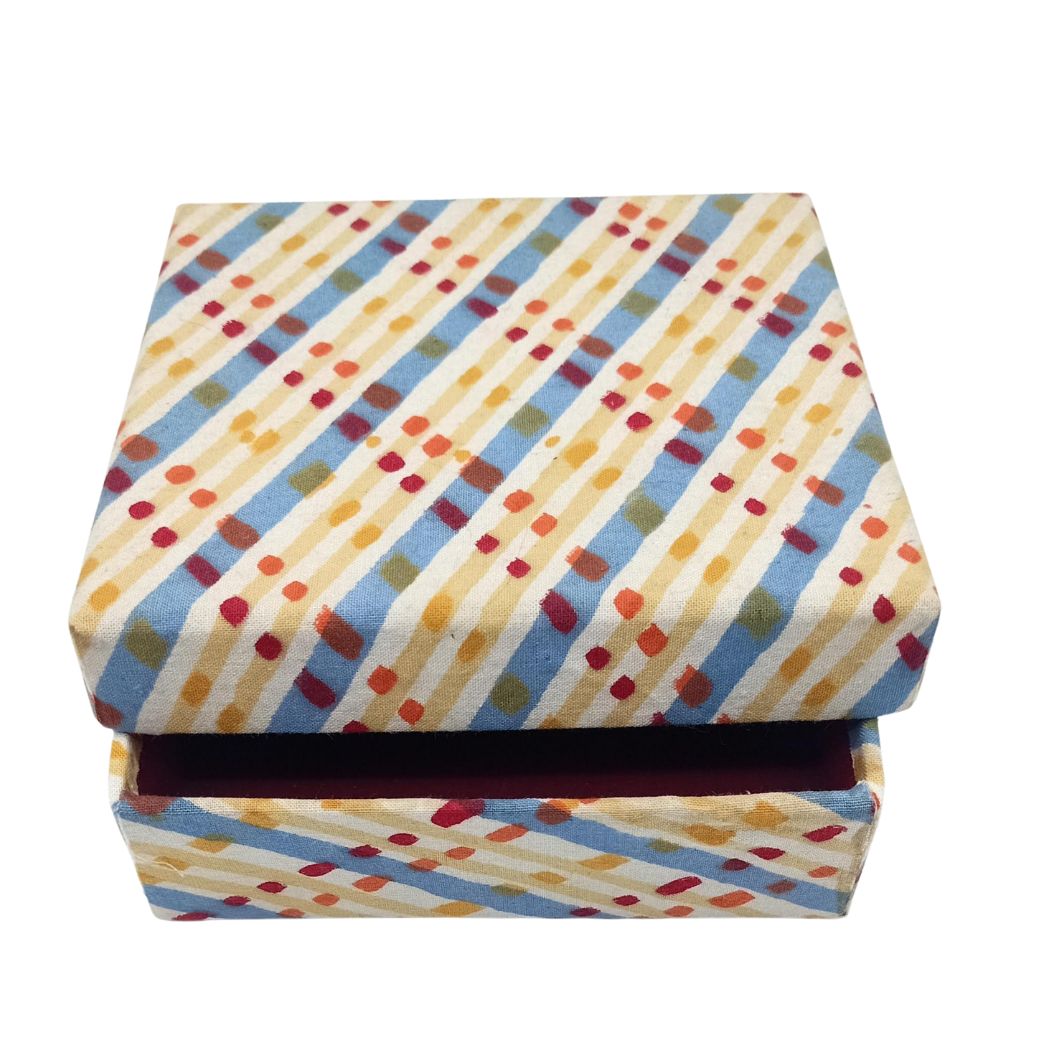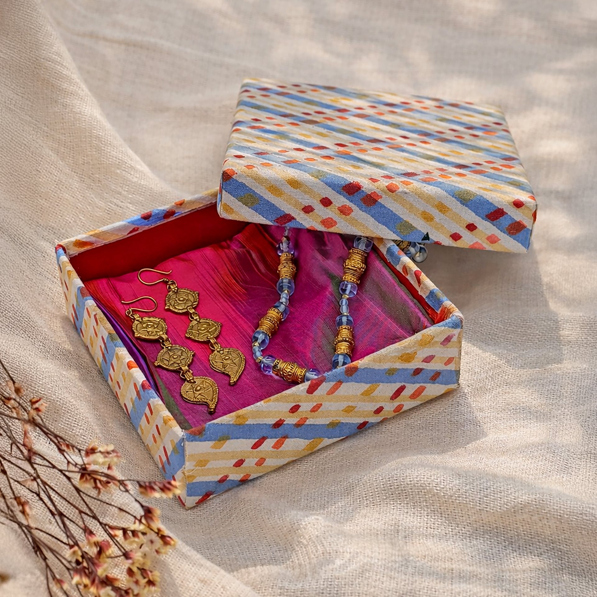 A thoughtfully curated gift hamper that celebrates colour, craft, and timeless elegance. This hamper features a beautifully hand-painted fabric box, inside which rests a vibrant handwoven silk stole, creating a luxurious setting for the treasures within.The hamper includes a pair of exquisite handcrafted brass earrings inspired by traditional motifs, paired with a delicate beaded necklace accented with brass elements. Each piece reflects skilled craftsmanship and an earthy, artisanal charm.