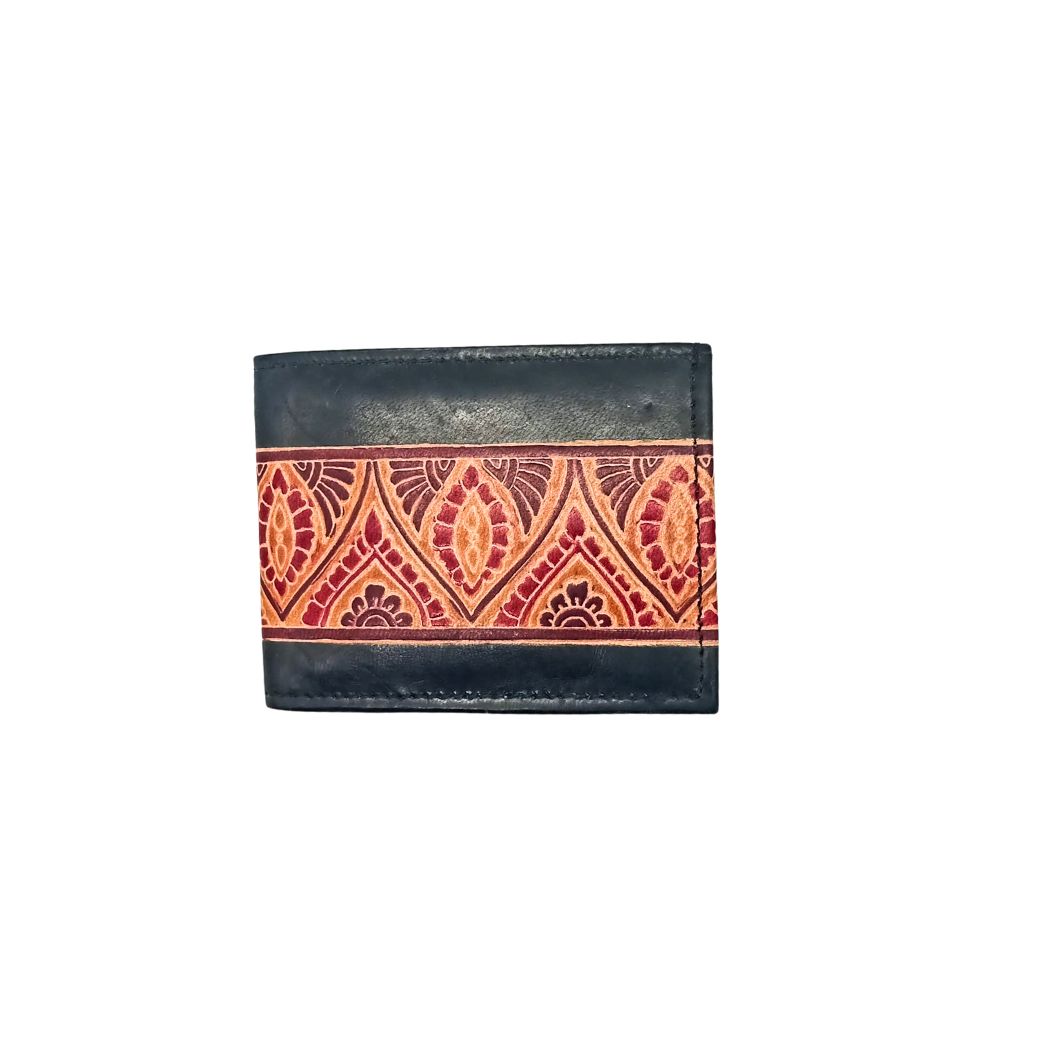 The textured black with mullicolur border leather men's wallet has been created using vegetable tanned goat skin. Each piece is embossed using a metal dye after which it is individually painted by hand. Exquisitely handcrafted, wallet makes a wonderful gift to your loved one.