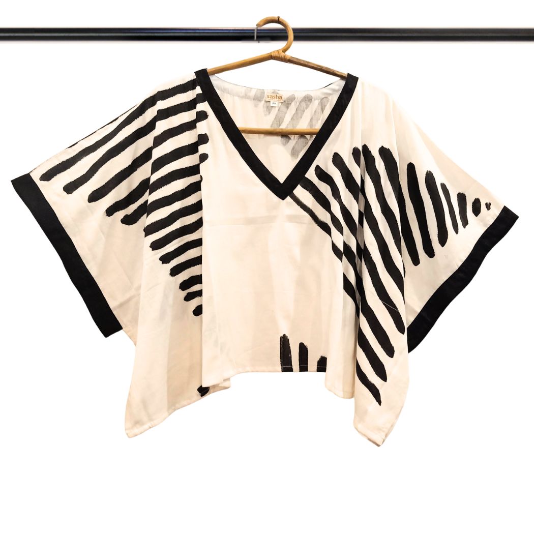 Effortlessly elegant and breezy, this off-white top features a minimal yet striking hand-inspired black stripes that adds an artistic touch. The relaxed, flowy silhouette with soft drape makes it perfect for warm days, while the subtle black piping along the edges enhances its modern contrast. A versatile piece that blends comfort with understated style.